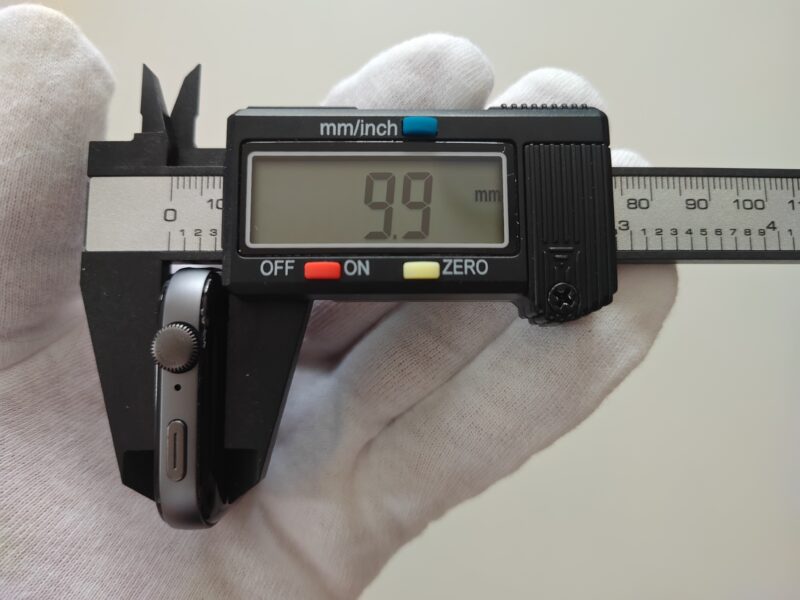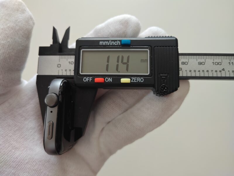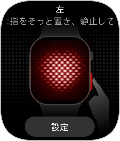 ウォッチをつけている腕とは反対の手の指で、本体側面下側の電飾ボタンにそっと触れ30秒まつだけで測定は完了です。